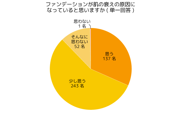 「ファンデーションが肌の衰えの原因になっていると思いますか」と質問をしたところ、「思う」が32%、「少し思う」が56% となり合計で88% の方が「ファンデーションが肌の衰えの原因になっている」と思っているという結果になりました。