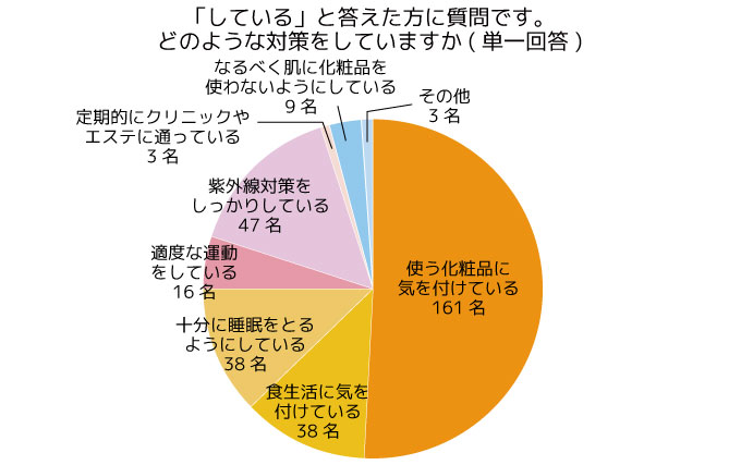 上記以外では「食生活に気を付けている」、「十分に睡眠をとるようにしている」が同じく12%、「適度な運動をしている」が5%、「なるべく肌に化粧品を使わないようにしている」が3%、「その他(肌に負担にならない物を選ぶ)など」、「定期的にクリニックやエステに通っている」が同じく1%という結果になりました。